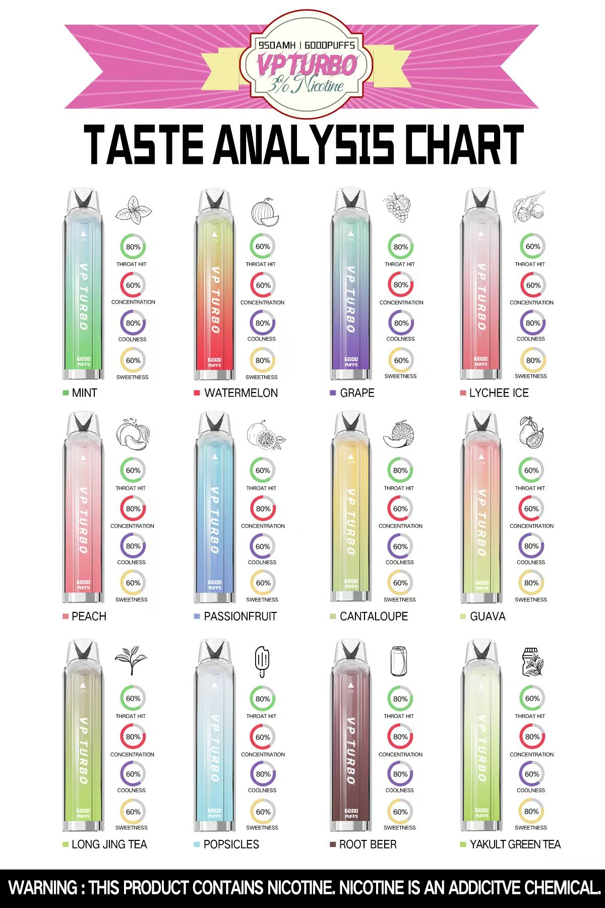 VP Turbo 6000 是一款設計簡約、攜帶方便、容量達 10ml 的一次性電子煙,最多可達 6000 口的抽吸次數,搭配多種風味選擇,深受追求便捷與持久口感的用戶喜愛。